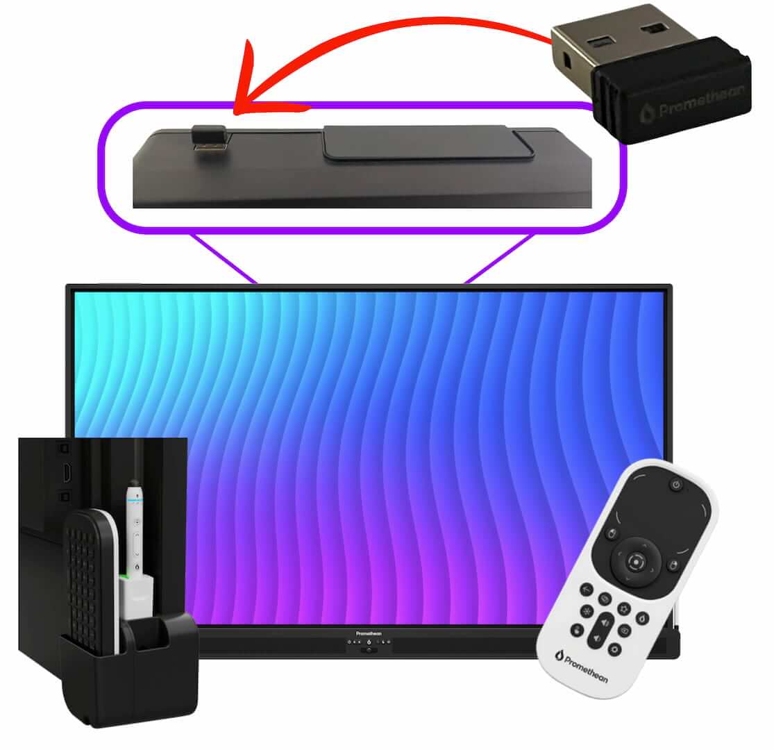 Similar to the ActivPen 2, the All-in-one Remote includes both a USB dongle and a charging cable. When you install the USB dongle, it will automatically pair the All-in-one Remote to your ActivPanel 10.