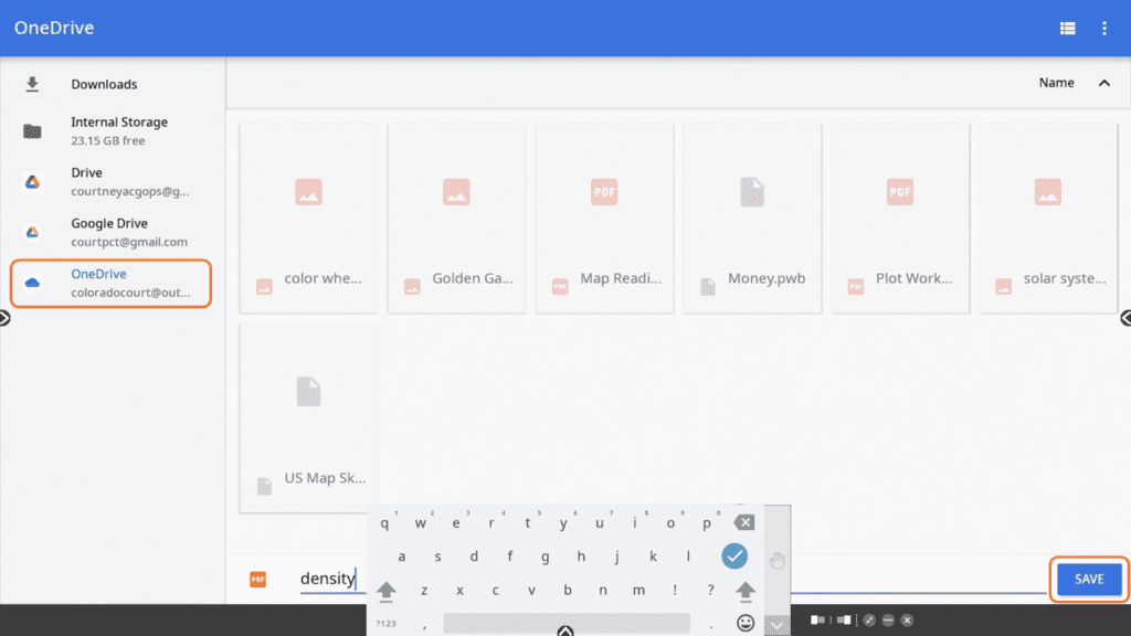 Select the Microsoft OneDrive account, give the file a title, then select SAVE.